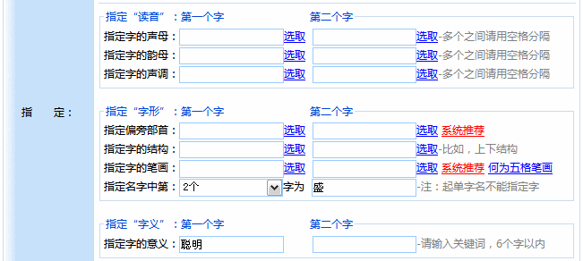 有些時(shí)候,您可能偏愛于具有某些讀音、偏旁部首、結(jié)構(gòu)或字義的漢字,希望在給孩子起名時(shí),使用這些信息。美名騰起名系統(tǒng)為您提供了按照指定音、形、義信息進(jìn)行起名的強(qiáng)大功能,幫助您起出滿意的名字。有關(guān)按照漢字音、形、義信息起名的詳細(xì)信息,請(qǐng)參閱:11. 怎樣指定名字用字的拼音信息?、12. 怎樣指定名字用字的偏旁部首信息?、13. 怎樣指定名字用字的結(jié)構(gòu)信息?及14. 怎樣通過指定字的字義進(jìn)行起名?。